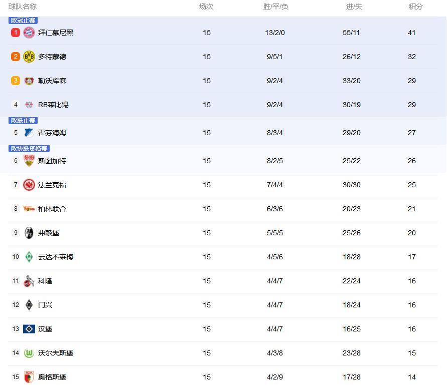 在联赛积分榜上,拜仁慕尼黑在第15轮结束后,战绩为13胜2平,积41分。 他们的老对手多特蒙德在早前结束的比赛中获胜,积分达到32分。 两者之间的分差依然是9分。 由于德甲联赛一共只有34轮,目前赛程尚未过半,9分的差距意味着拜仁即便在未来一轮比赛中失利,而多特蒙德获胜,领先优势依然有6分之多。