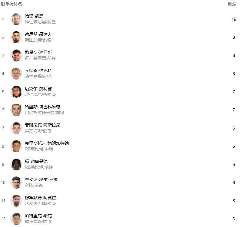 目前德甲射手榜的形势,清晰地反映了凯恩的个人统治力。 他以19个进球与曼城的埃尔林·哈兰德在欧洲金靴竞争中齐头并进。 但值得注意的是,凯恩完成这19个进球只用了15轮联赛,而哈兰德在英超达到19球则用了17轮。 在德甲内部,射手榜第二名的争夺者有多人,如斯图加特的塞罗·吉拉西、勒沃库森的维克多·博尼费斯以及本场进球的拜仁队友迪亚斯,他们都打进了8球。 凯恩对第二名球员的领先优势,已经达到了惊人的11球。