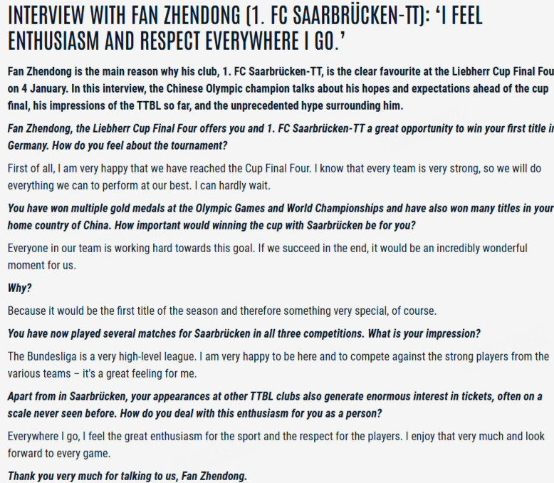 德甲直播,德甲赛程,德甲积分榜,拜仁vs多特直播,德甲比分预测/专为中文球迷打造的德甲资讯站,覆盖2025赛季直播入口、赛程安排、积分榜更新与竞彩比分预测,聚焦拜仁、多特、莱比锡、勒沃库森等焦点球队。中国乒乓球运动员樊振东近日接受了德国乒乓球甲级联赛(Bundesliga)的官方专访,就其加盟萨尔布吕肯俱乐部以来的表现、即将展开的德国杯半决赛与决赛前景,以及对德甲联赛整体竞技环境和球迷氛围的切身感受进行了深入交流。此次采访不仅展现了樊振东作为一名世界级选手的职业素养,也反映出他融入欧洲职业乒乓球体系过程中的积极态度与高度专注。