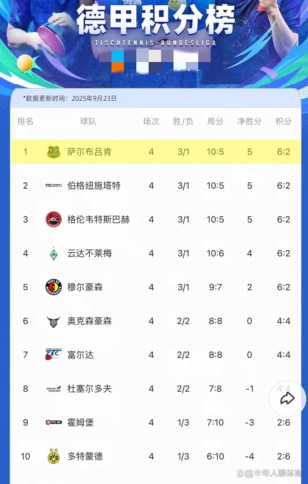 格伦韦特斯巴赫队也没好到哪儿去。 他们对阵的明明是积分榜中游队伍,却被打得找不着北。 第一单打施巴斯蒂安·杰姆斯苦战五局落败,第三单打更是被直落三局带走。 虽然双打组合顽强扳回一城,但整体状态低迷得让人怀疑是不是集体吃了变质香肠。
