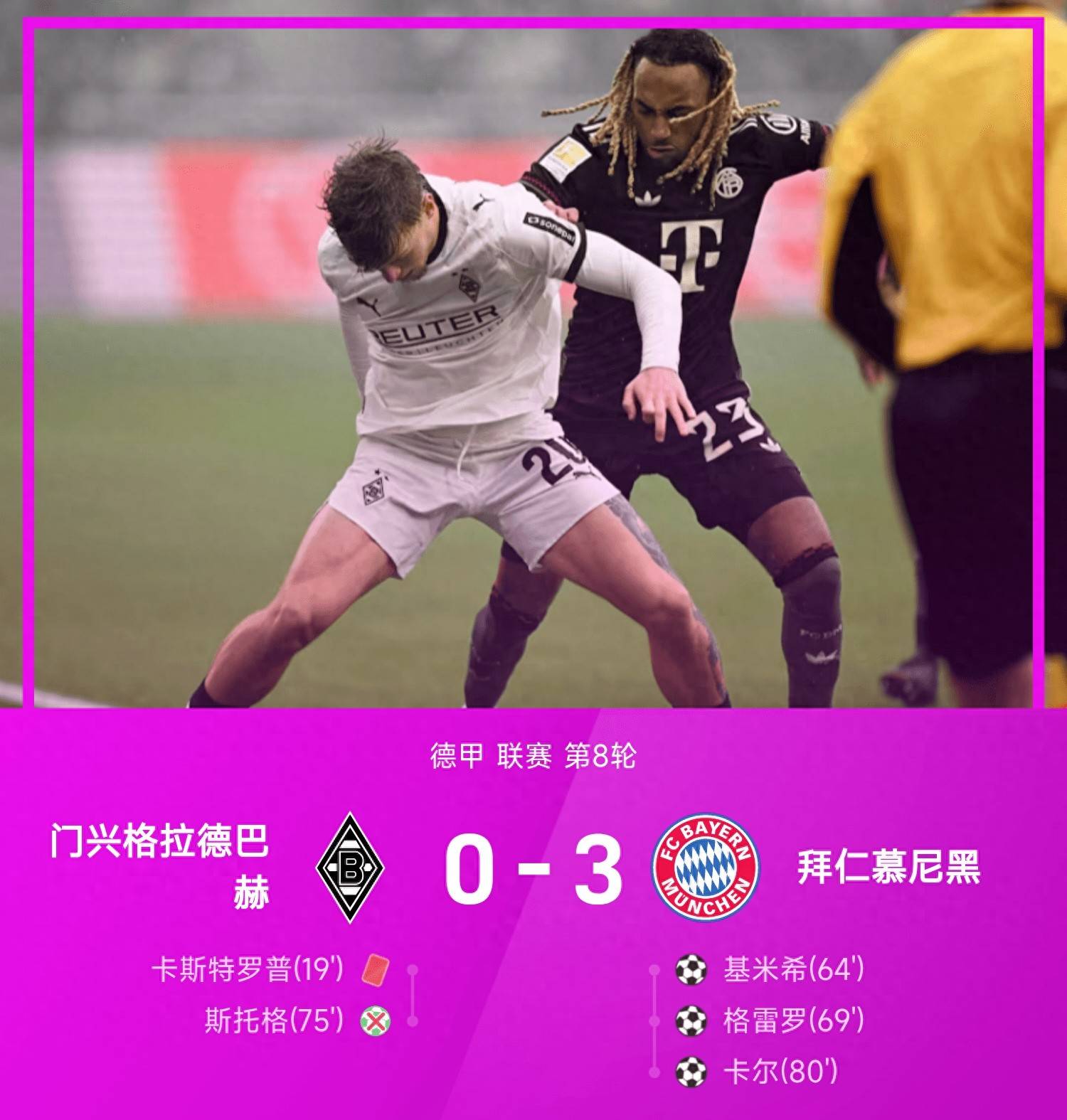 德甲直播,德甲赛程,德甲积分榜,拜仁vs多特直播,德甲比分预测/专为中文球迷打造的德甲资讯站,覆盖2025赛季直播入口、赛程安排、积分榜更新与竞彩比分预测,聚焦拜仁、多特、莱比锡、勒沃库森等焦点球队。10月25日 25-26赛季德甲联赛第8轮,门兴格拉德巴赫坐镇主场迎战拜仁慕尼黑。此役上半场,卡斯特罗普飞铲迪亚斯染红被罚下。易边再战,基米希推射破门打破僵局,格雷罗单刀推射再入一球,斯托格罚失点球,卡尔轰入世界波。全场比赛结束,拜仁慕尼黑3-0门兴格拉德巴赫,夺取赛季开局13连胜。拜仁创下队史首次赛季开局13场全胜纪录