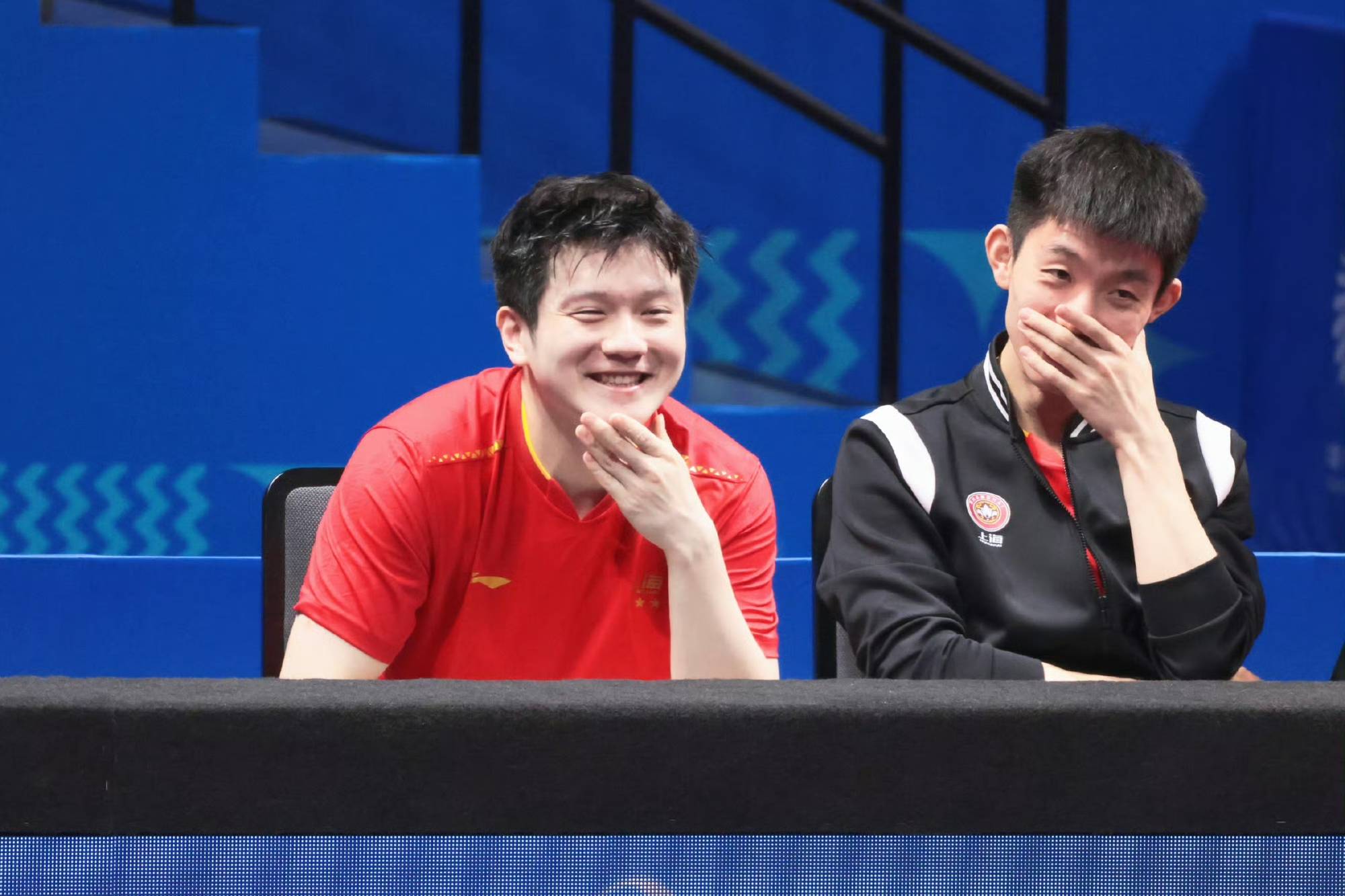 在单打赛场,樊振东已成功晋级四强,在团体赛中代表上海地产队出战江苏挺拔队。由于双方实力悬殊,上海队几乎没有费力便以3-0轻松战胜对手。樊振东在第二盘出战时,以3-1战胜孙闻,贡献了一分。没有参赛时,樊振东在场边与队友们开心互动,不时展现出萌态,令旁人感到轻松愉快。