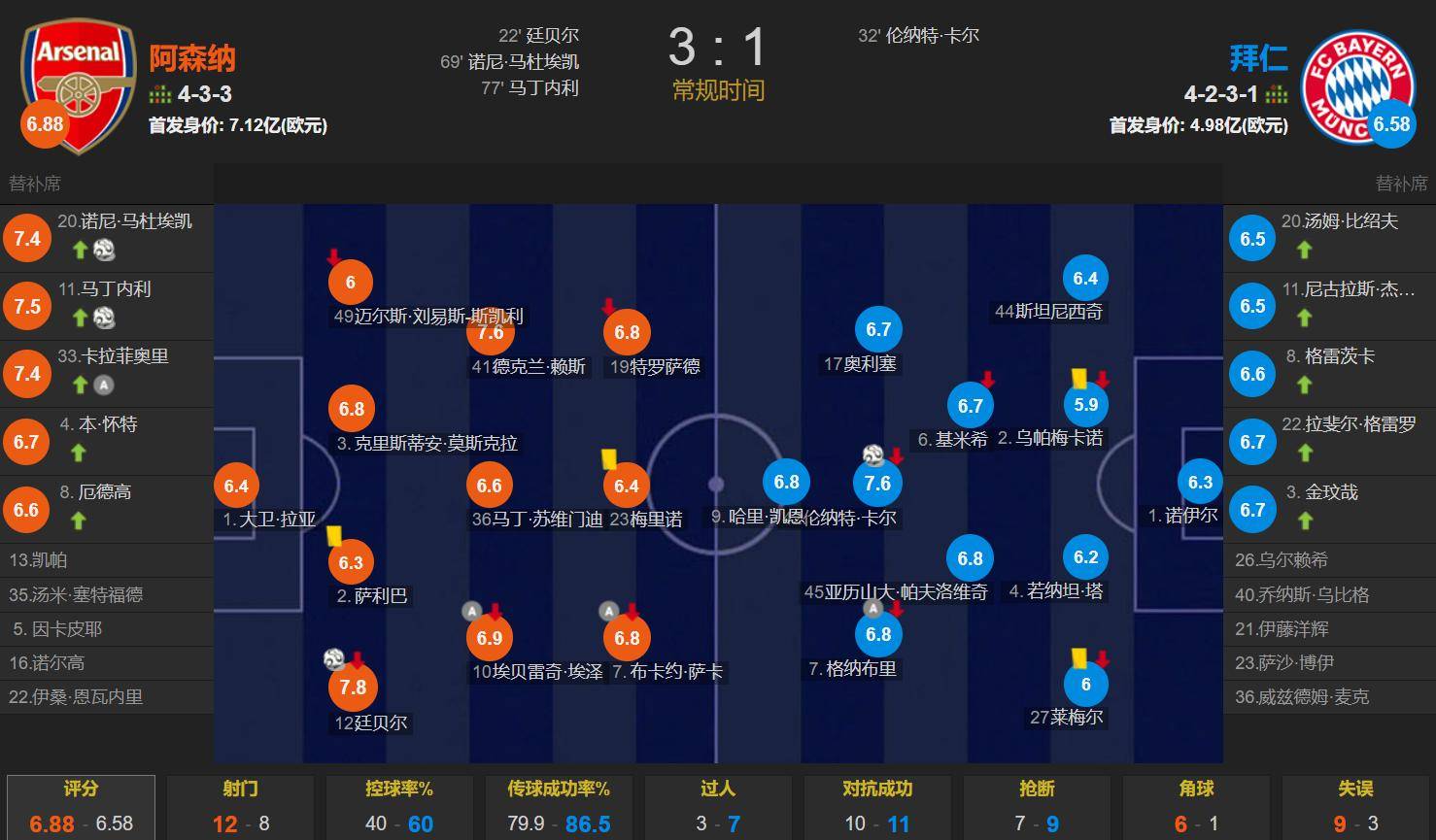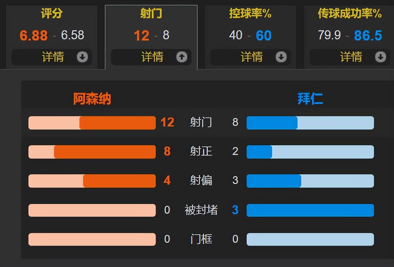 全场比赛,阿森纳的控球率为40%,一共12次射门,其中8次射正;拜仁一共有8次射门,其中2次射正。返回搜狐,查看更多