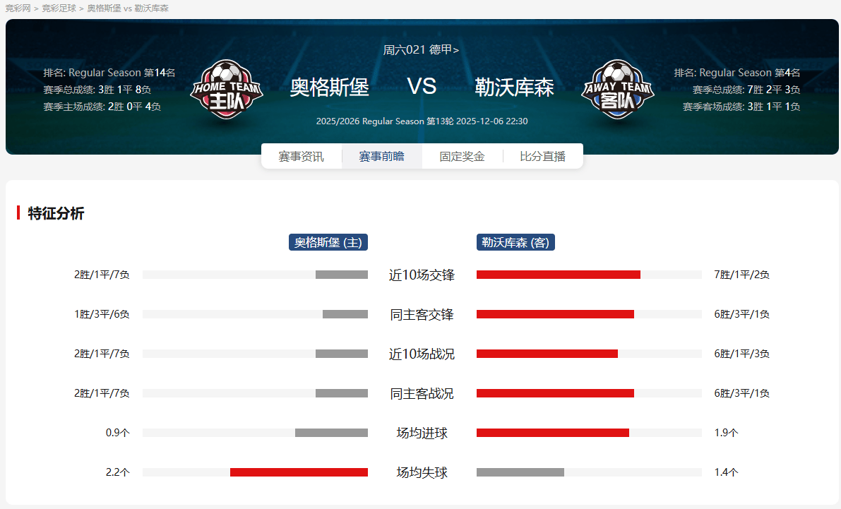 德甲直播,德甲赛程,德甲积分榜,拜仁vs多特直播,德甲比分预测/专为中文球迷打造的德甲资讯站,覆盖2025赛季直播入口、赛程安排、积分榜更新与竞彩比分预测,聚焦拜仁、多特、莱比锡、勒沃库森等焦点球队。德甲联赛的激烈程度从未因时间推移而褪色,2025年12月6日晚22:30,一场关乎积分榜格局的焦点战即将在奥格斯堡主场打响——奥格斯堡VS勒沃库森。一边是主场韧性十足的“黑马挑战者”,一边是志在卫冕的“德甲豪强”,这场对决不仅是技战术的碰撞,更是两支球队赛季目标的关键一战。本文将从战术风格、近期状态、历史交锋三大维度展开分析,并给出专业答案。