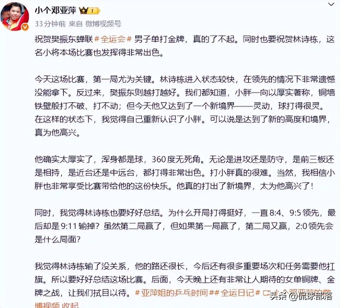 她觉得重新认识了小胖,为他高兴,这话不是随便说,邓亚萍是大满贯前辈,眼光毒辣,她看到樊振东不光厚实,还多了变幻,让对手难猜。