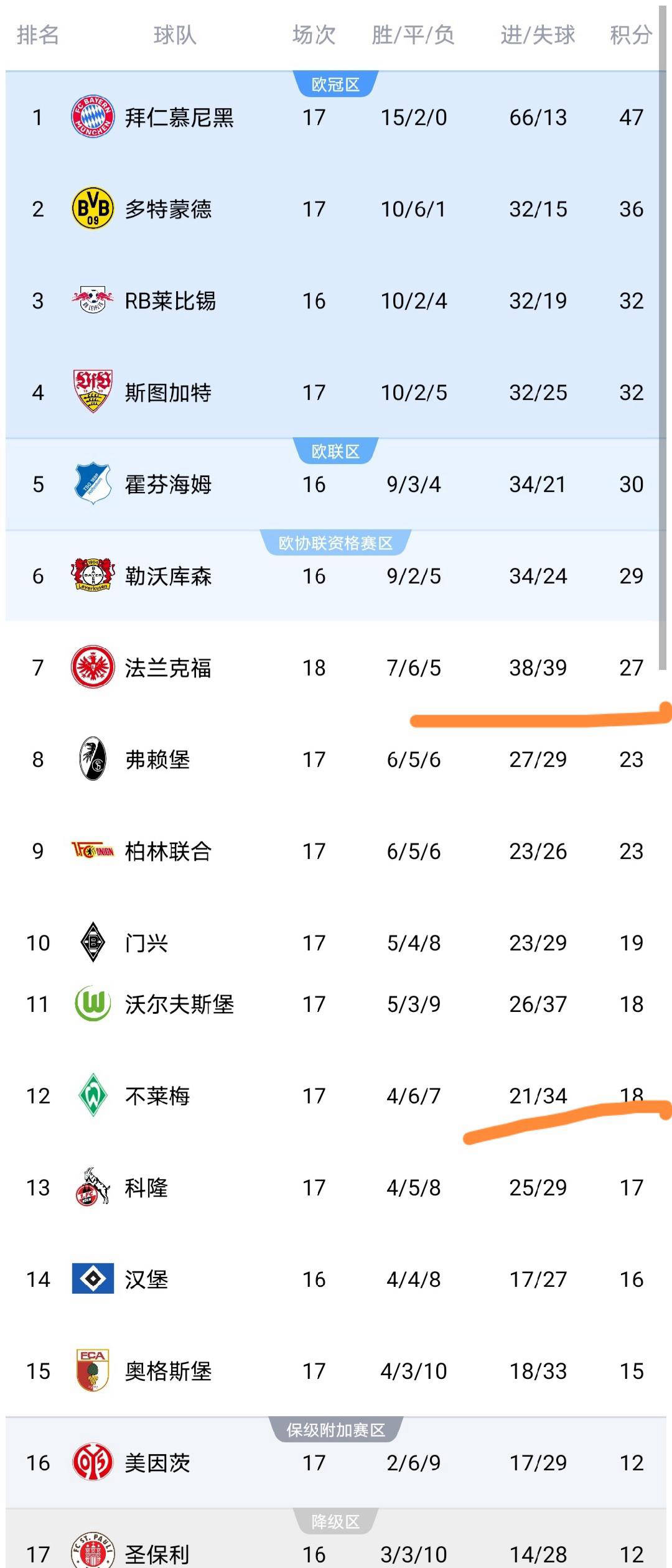 随着这场比赛的结束,法兰克福积27分稳居第七位,虽距离第六名勒沃库森还有两分差距,但仍保持竞争力。而不莱梅经过1分的加持,累计18分,仅落后排名第十的门兴一分,稳固了在中游的席位。值得注意的是,拜仁慕尼黑依然牢牢占据积分榜首,整体实力遥遥领先,其他球队如多特蒙德、莱比锡和斯图加特只能追逐亚军位置,显示出拜仁俨然成为难以逾越的霸主。