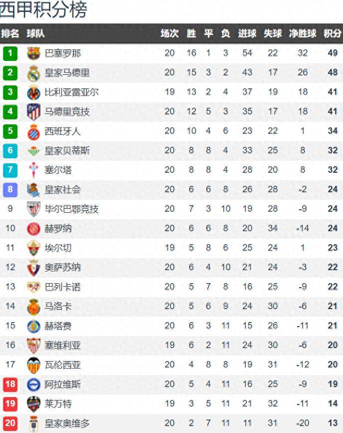 西甲20轮战罢,前二球队还是皇萨,由于本轮西甲巴萨1-2输给皇家社会,丢掉了3分,这让巴萨领跑优势缩小至1分,皇马1分之差紧随其后。西甲本赛季争冠的悬念再一次变大,或许第二回合的西班牙国家德比就是争冠关键战。