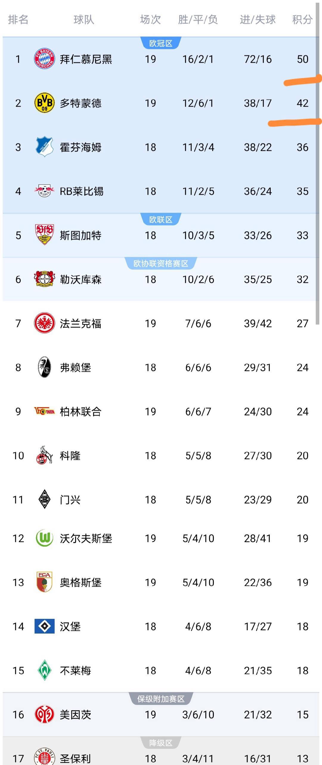 保级方面,奥格斯堡取胜后积19分排名第13;不莱梅输球后仅积18分列第15,距离降级区只有3分,保级压力骤增;而勒沃库森赢得比赛后攀升至32分,稳步逼近欧战资格区。霍芬海姆稳定在第3名,积分36分;法兰克福落败后以27分排名第7,与欧战区还存在5分差距。莱比锡同样表现出色,保持第三的位置;海登海姆则依然垫底。沃尔夫斯堡败北后排名第12,美因茨获胜升至第16名,显露出较强的保级希望。