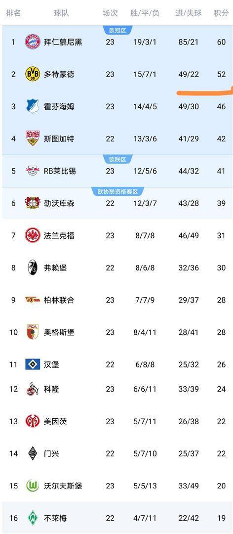 当所有比赛尘埃落定,德甲积分榜呈现出了一幅清晰的图景。 拜仁慕尼黑23战19胜3平1负,积60分,一骑绝尘。 多特蒙德少赛一场,22战积51分,已经被甩开了8分的差距。 霍芬海姆46分排在第三,斯图加特42分第四,莱比锡41分第五,勒沃库森39分第六。 欧冠资格的争夺变得异常激烈,从第三到第六名,分差只有7分。 法兰克福31分排在第七,距离欧战区也有8分之遥。 降级区里,海登海姆13分垫底,圣保利17分,云达不莱梅19分。