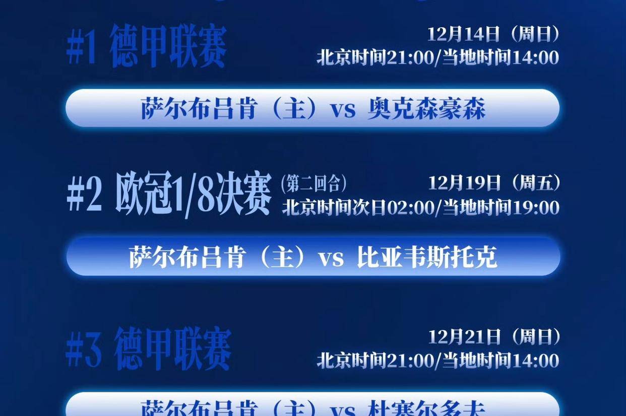 12月份的赛程主要有三场,其中一场是12月14日的德甲比赛,萨尔布吕肯队在主场迎战奥克森豪森。这场比赛的时间对中国的球迷来说挺方便的,晚上9点就开始了。