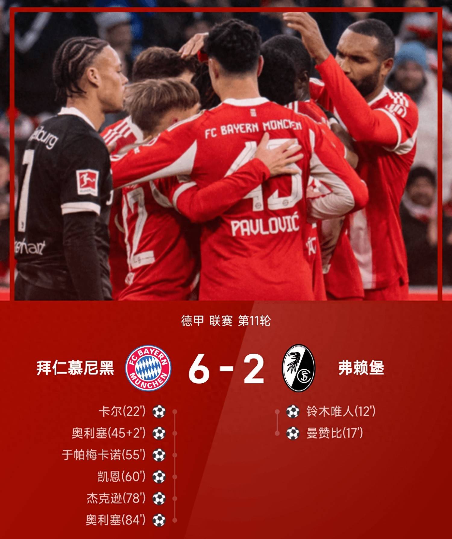 德甲直播,德甲赛程,德甲积分榜,拜仁vs多特直播,德甲比分预测/专为中文球迷打造的德甲资讯站,覆盖2025赛季直播入口、赛程安排、积分榜更新与竞彩比分预测,聚焦拜仁、多特、莱比锡、勒沃库森等焦点球队。11月23日25/26赛季德甲联赛第11轮,拜仁慕尼黑主场以6-2逆转弗赖堡。铃木唯人和曼赞比的进球,曾助弗赖堡取得2-0领先的梦幻开局;奥利塞2射3传星光四射,卡尔传射建功,于帕梅卡诺、凯恩和杰克逊联袂破门,助拜仁成功完成逆转。拜仁在各条战线仍然保持不败,在德甲赛场以10胜1平积31分强势领跑。